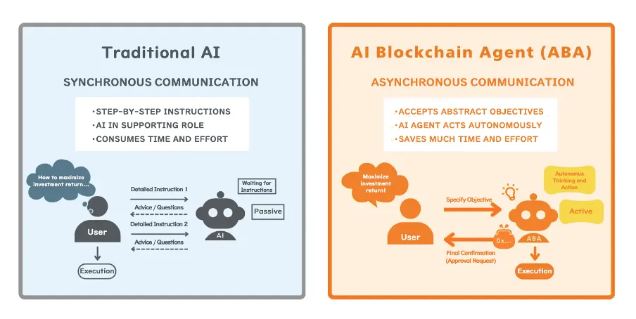 The dawn of an asynchronous civilization in which an AI Blockchain Agent (ABA) acts simply by receiving specified objectives.
