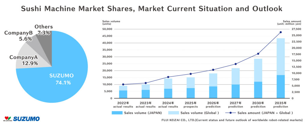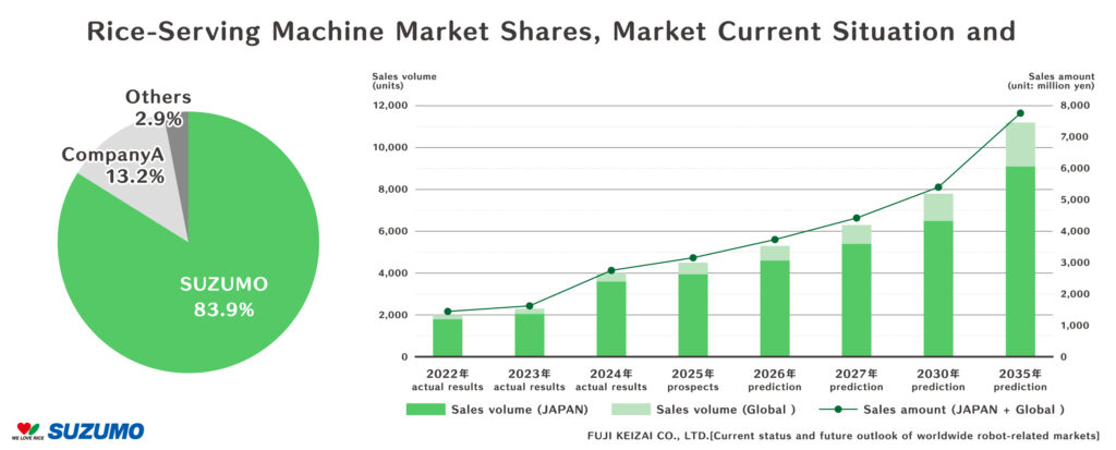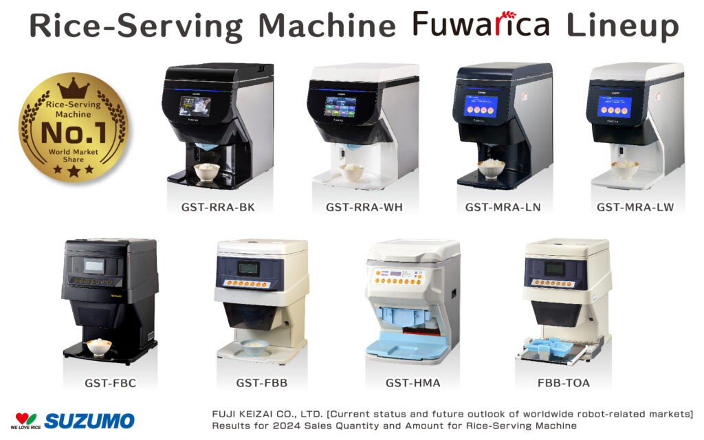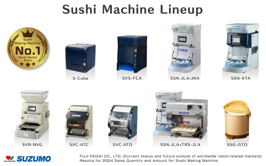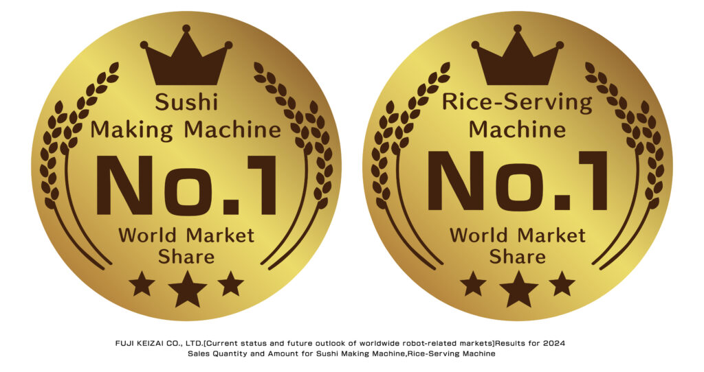 Suzumo Machinery Co., Ltd. (Headquarters: Nakano Ward, Tokyo; President: Toru Taniguchi) is pleased to announce that it has achieved the No.1 market share in the global market as well as and the Japan market for “Sushi Machine” and “Rice-Serving Machine” in 2024 sales results in unit sales and sales amounts volume and value, as reported in the report.[Current status and future outlook of worldwide robot-related markets]” published in August 2025 by Fuji Keizai Co., Ltd.
